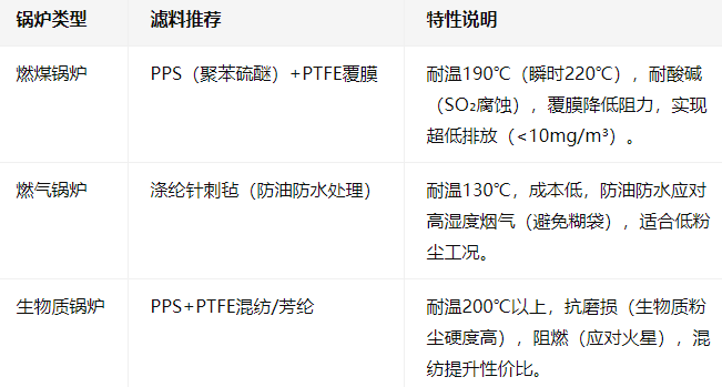 滤料是除尘器的“心脏”,需匹配烟气温度、腐蚀性、粉尘特性: