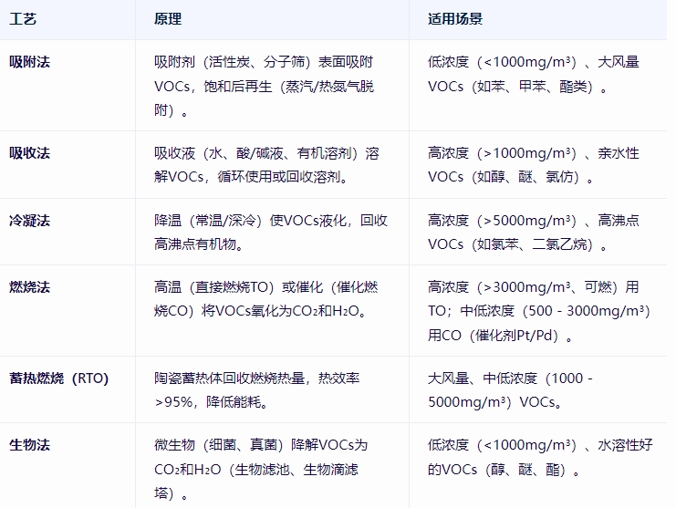 高浓度VOCs:先冷凝回收有机物(>5000mg/m³),残余气再燃烧(TO/RTO)。