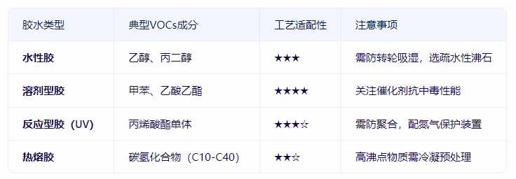 胶水废气可能含硅氧烷、高沸点物质(如某些树脂单体),需配置前置冷凝器或活性炭吸附床,防止转轮孔道堵塞。