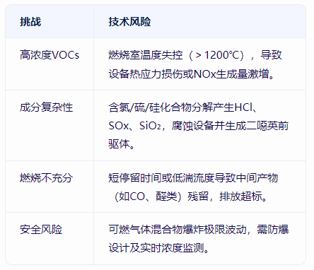 优势:无需催化剂,适应性强,可处理高浓度废气(VOCs浓度可达25% LEL)。