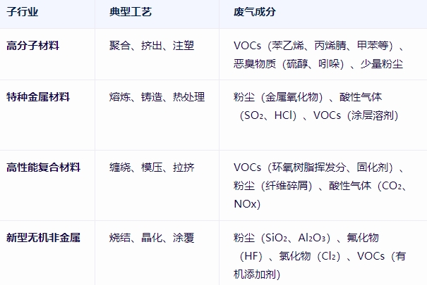 新材料生产涉及合成、改性、成型等工艺,废气来源及成分差异显著,需分类解析: