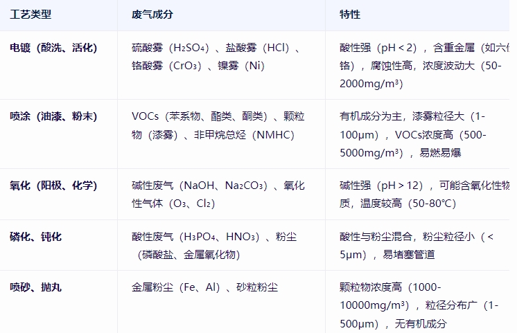 表面处理废气因工艺不同,成分差异显著,常见类型及特性如下: