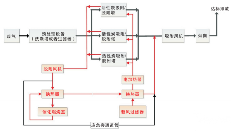由离心风机将大风量、低浓度有机废气吸入活性炭吸附床,在吸附床内与多层蜂窝状活性炭充分净化(吸附),活性炭内部逐渐富集浓缩大量有机废物,而洁净的气体则排入大气;通过燃烧装置产生的高温气体经换热之后通入活性炭吸附床,使内部有机废物90℃高温气化从活性炭孔隙中逸散而出,此时的废气浓度远远高于初始吸附的废气浓度,然后进入催化燃烧装置(350℃)进行氧化分解成CO2和H2O等无害气体,气体经由热交换器将热量传递再次用于脱附,最后排入大气,以此完成一整套净化流程。