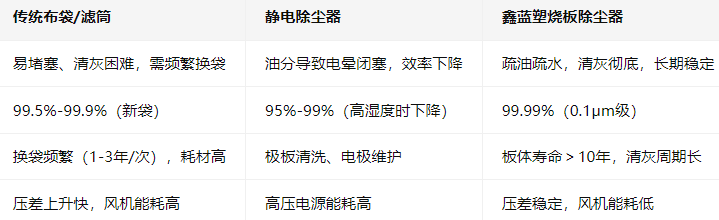 必博环保的塑烧板除尘器在含油含水粉尘治理中,相比传统方案(布袋、滤筒、静电)优势显著: