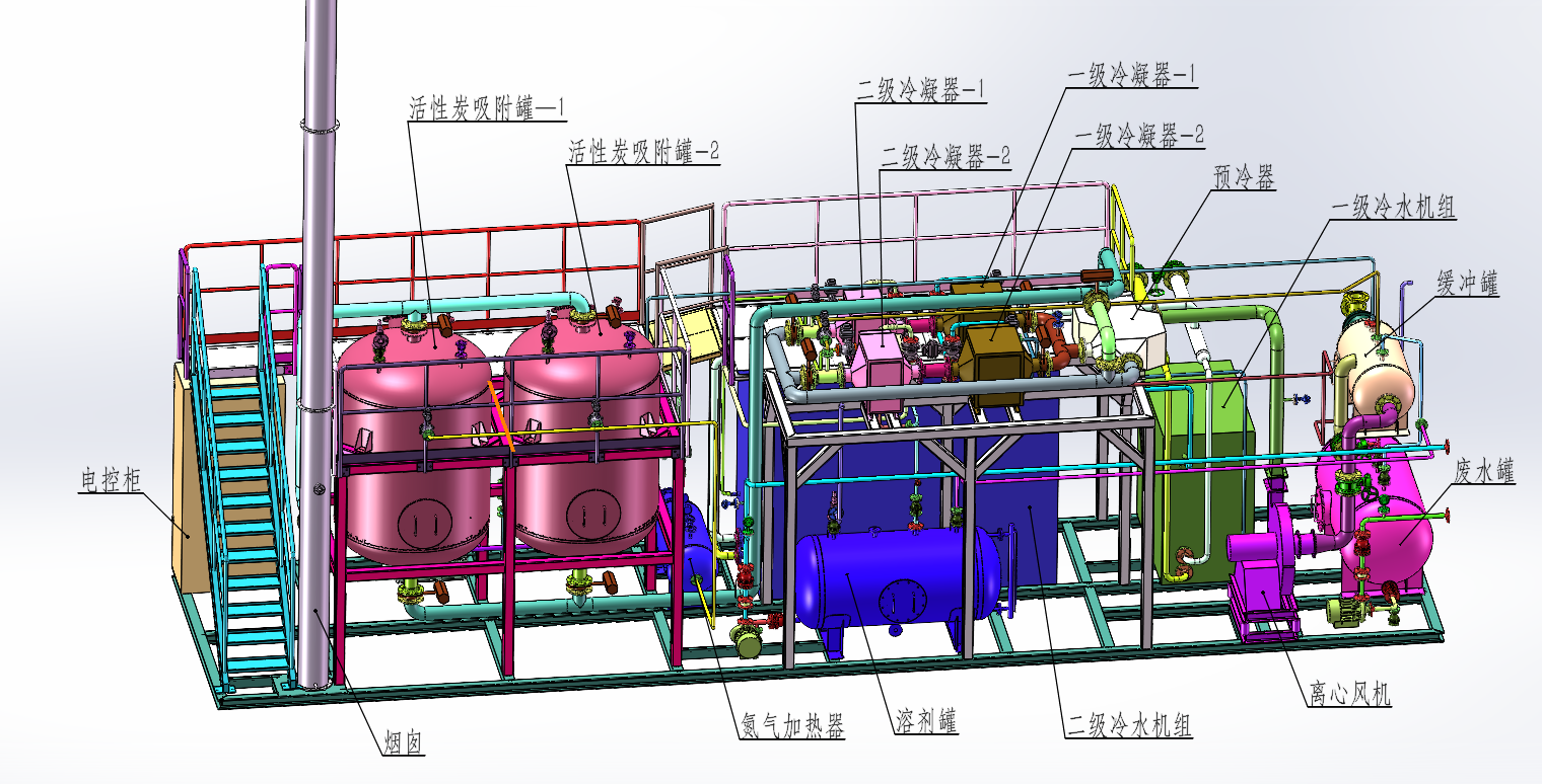 高浓度废气(≥5000mg/m³)采用“冷凝回收+RTO”工艺,先回收高价值溶剂降低原料损耗,再将未冷凝废气送入RTO焚烧处理,净化效率≥99%,兼顾资源回收与达标排放;中浓度废气(1000-5000mg/m³)采用“冷凝+活性炭吸附脱附”工艺,吸附饱和后通过高温氮气(纯度≥99.9%)脱附,高浓度脱附气返回冷凝系统回收,提升资源利用率;低浓度恶臭废气采用“冷凝+生物洗涤”工艺,既去除VOCs,又针对性降解含硫、含氮恶臭物质,除臭效率≥95%