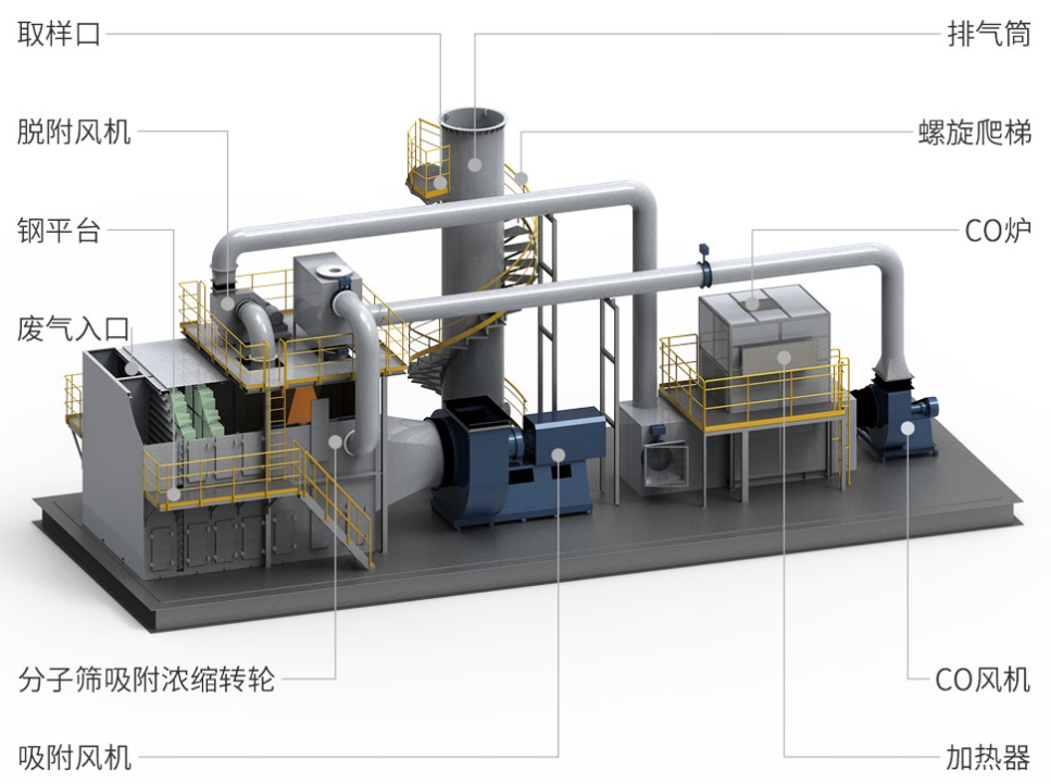 核心工艺:干式过滤+沸石转轮+CO(催化燃烧),处理效率99%+